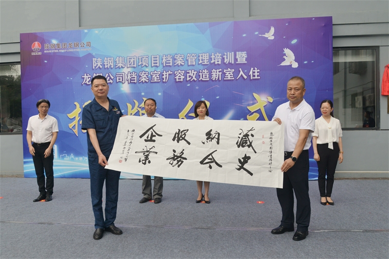 項(xiàng)目施工方陜西金銀島建筑工程有限公司贈(zèng)予龍鋼公司檔案室 “藏史納今,服務(wù)企業(yè)”的題字。
