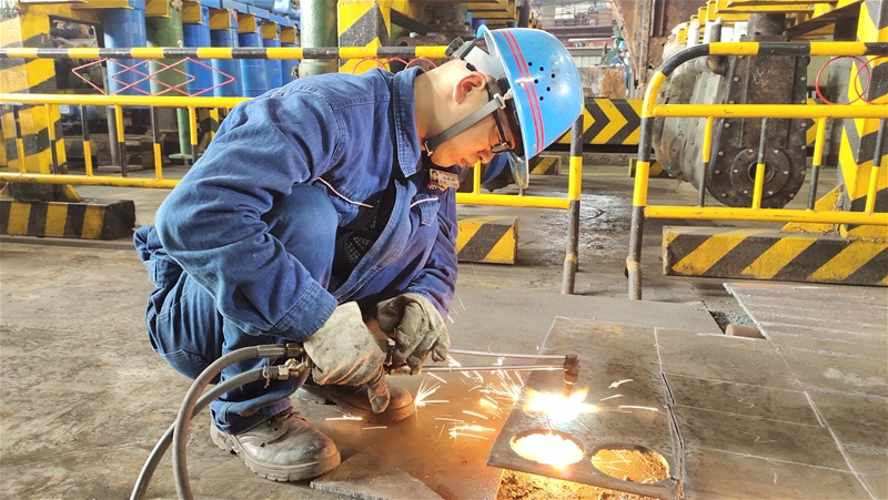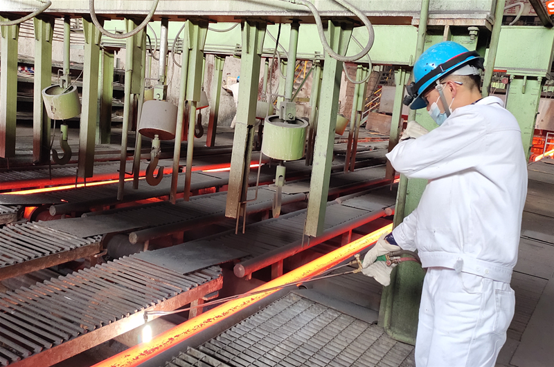 在4#連鑄機臺下,兩名拉矯剪切工正在輥道旁切割三流的連角,切割人員一手拿著割槍,一手半遮住面部,在鋼坯的炙烤下他們額頭上滲出汗水,但他們卻沒有一絲動搖,依然雙目不移,緊緊握著割槍切割,認真而謹慎,在火花飛濺中快速且標準地將連角切斷,只為確保割縫在標準范圍內(nèi),降低消耗。剛切割完鑄坯的他們顧不上額頭上的汗水,走向定尺桿的位置,抬起定尺桿,三步并作兩步跨越輥道,對溫度最高的中間流紅坯進行長度測量,動作統(tǒng)一、干脆利落。為了保證鑄坯的定尺合格率達到100%,像這樣的場景一班下來需要重復(fù)五六次,但,他們卻沒有任何怨言,默默堅守在自己的崗位,為降本增效做出自己的貢獻。