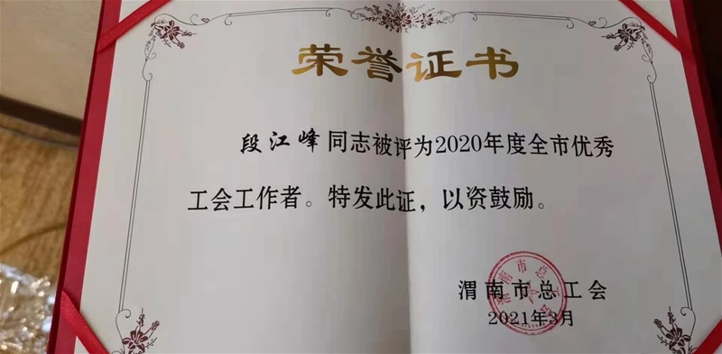 3月16日,在渭南市總工會(huì)二屆十四次全委(擴(kuò)大)會(huì)上,龍鋼公司工會(huì)工作榮獲市總工會(huì)多項(xiàng)榮譽(yù),并現(xiàn)場(chǎng)受到了表彰。龍鋼公司工會(huì)榮獲“工會(huì)在您身邊竭誠(chéng)為您服務(wù)”主題活動(dòng)創(chuàng)新服務(wù)一等獎(jiǎng)和“基層示范點(diǎn)”榮譽(yù)稱號(hào),段江峰榮獲2020年度全市優(yōu)秀工會(huì)工作者。