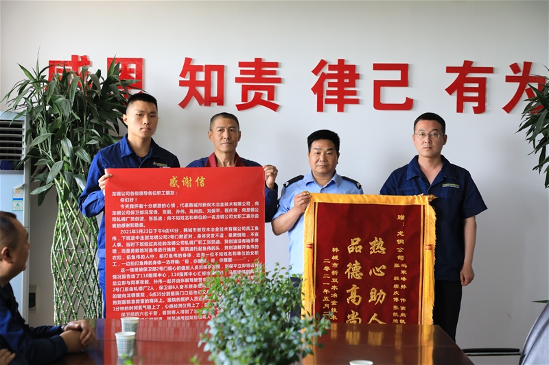 5月27日,同興公司協(xié)作單位韓城市新雙木冶金技術有限公司負責人,將一面寫有“熱心助人 品德高尚”的錦旗以及一封感謝信送到公司,對公司軋鋼廠職工賀創(chuàng)波等三人和保衛(wèi)部職工馮軍鋒等六人表示感謝,感謝他們在關鍵時刻見義勇為,對外協(xié)單位職工魚偉施以援手的救命之恩和感激之情。