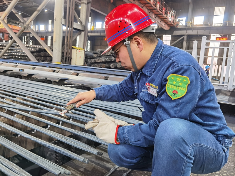 在周圍環(huán)境溫度達(dá)40℃的棒材三線,一股熱浪襲來,作業(yè)長張?chǎng)晤櫜簧现丝荆每ǔ邷y(cè)量棒材幾何尺寸,以實(shí)際行動(dòng)踐行“人人做精英,根根求精品”的“精”文化,確保生產(chǎn)出來的每一根鋼材都是精品。