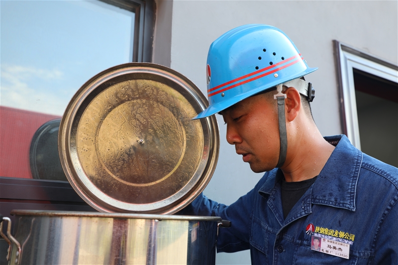 在禹龍大班門口,薛虎林檢查完電動(dòng)小車,頂著32℃烈日,準(zhǔn)備將鋼材樣品送至試驗(yàn)室進(jìn)行性能、成分檢驗(yàn),為產(chǎn)品質(zhì)量做好服務(wù)。