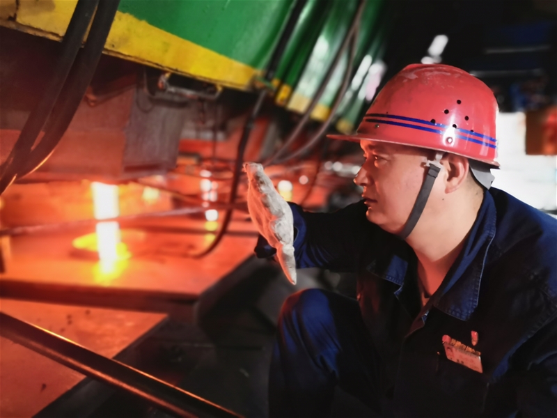 “各崗位請(qǐng)注意,下一爐開始換包……”進(jìn)入連鑄生產(chǎn)車間,一股熱浪迎面襲來(lái),主控工的廣播聲在轟隆隆的設(shè)備中清脆而響亮。遠(yuǎn)遠(yuǎn)望去,大包內(nèi)涌動(dòng)的鋼水散發(fā)著熾熱的火光,仿佛又把人拉回酷暑。