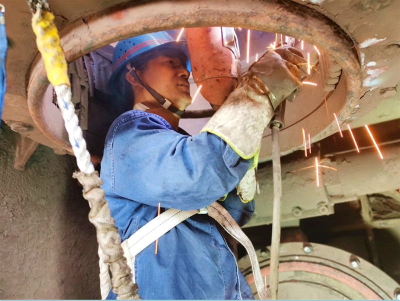 在現(xiàn)場,鉗工劉建軍綁好安全帶,快速進入到不足四平方米的閥箱開始受限空間作業(yè)。他認(rèn)真查看著料斗的每一處刷槽現(xiàn)象,接過精細(xì)制作的10公分六棱鋼,一點一點將六棱鋼卡槽焊接牢固。一根、兩根、三根……伴隨著六棱鋼越來越多,劉建軍頭上的汗水不斷涌出,流進眼睛里。只見他用袖口簡單抹了一把汗,又接著檢查沖刷口……一干就是20多分鐘。