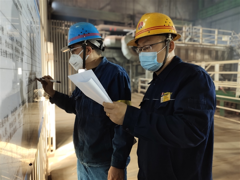 “今天混料機積料清理已經完成。”“臺車拆卸爭取明天早上拆卸完畢。”“轉臂式液密封環(huán)冷機改造項目采取24小時輪班制度……”在400㎡燒結機檢修推進工作會上,檢修各項目負責人正在逐一匯報當日項目進度。