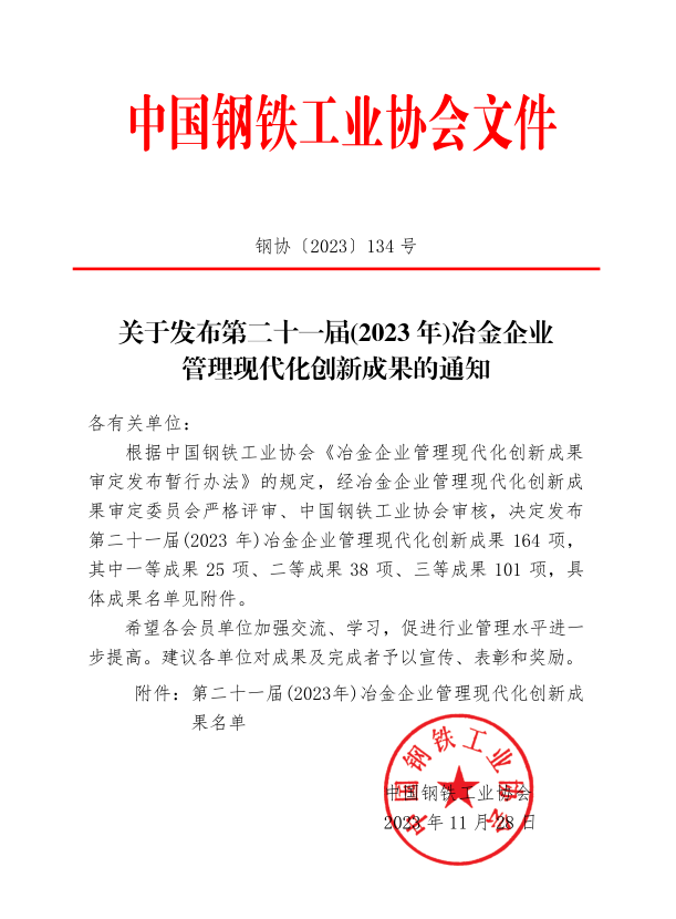 近日,從鋼協(xié)〔2023〕134號文件獲悉,在第二十一屆(2023年)冶金企業(yè)管理現(xiàn)代化創(chuàng)新成果評選中,龍鋼公司3項(xiàng)創(chuàng)新成果獲獎。其中《以智能化改造與“四型”建設(shè)為基礎(chǔ),打造氣體安全智慧運(yùn)行標(biāo)桿》獲得二等獎,《以經(jīng)營管控為核心構(gòu)建生產(chǎn)、成本與市場聯(lián)動機(jī)制的實(shí)踐與探索》和《基于一罐制的低成本冶煉管理實(shí)踐》獲得三等獎。