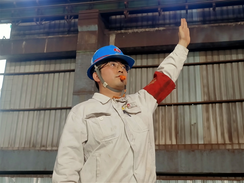 安全監(jiān)護(hù)人員孫立臂戴紅袖章,口含沖鋒哨,在臺(tái)車平面的行車下,手勢(shì)規(guī)范,指揮幾十噸重的行車,就像一名高空作業(yè)“交警”,全面保障檢修人員安全。