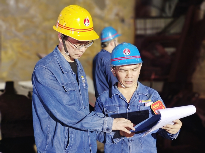 針對生產(chǎn)過程中鐵水罐結(jié)蓋嚴(yán)重這一情況,混鐵爐工指揮天車進(jìn)行鐵錐壓蓋操作,一次鐵錐壓蓋雖然只有短短的幾分鐘,但必須“一快二穩(wěn)三準(zhǔn)”,并且不能影響轉(zhuǎn)爐兌鐵,絲毫不能有差錯?;扈F爐工沒有任何抱怨和懈怠,他們一絲不茍地作業(yè),作業(yè)過程艱難而有序。雖然時值秋季,爐臺上依舊火熱,一個班下來,他們的工服始終是濕的,背上沾滿了鐵屑,汗水像斷了線的珠子,順著臉頰滾落。而他們顧不上這些,只緊緊盯著每一罐鐵水,克難攻堅,與時間賽跑、與炙熱戰(zhàn)斗,確保高質(zhì)量完成保供任務(wù)。