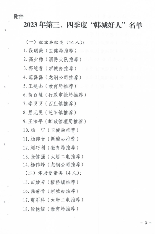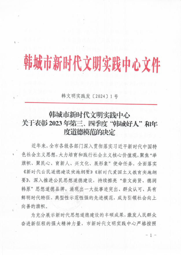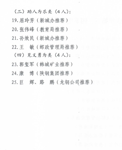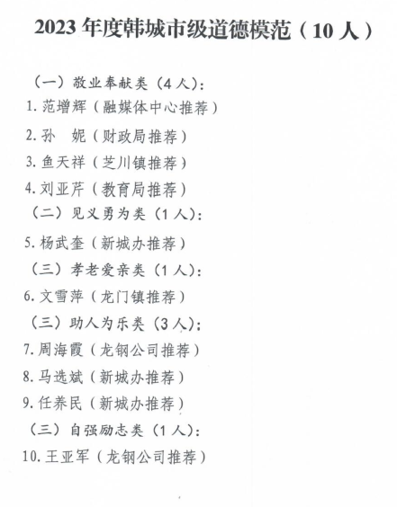 近日,韓城市2023年第三、四季度“韓城好人”和年度道德模范名單出爐。公司6名職工“榜上有名”。其中范磊磊、楊偉峰榮獲敬業(yè)奉獻(xiàn)類“韓城好人”,巨輝、路鵬榮獲見義勇為類“韓城好人”,周海霞榮獲助人為樂類“道德模范”,王亞軍榮獲自強(qiáng)勵志類“道德模范”。