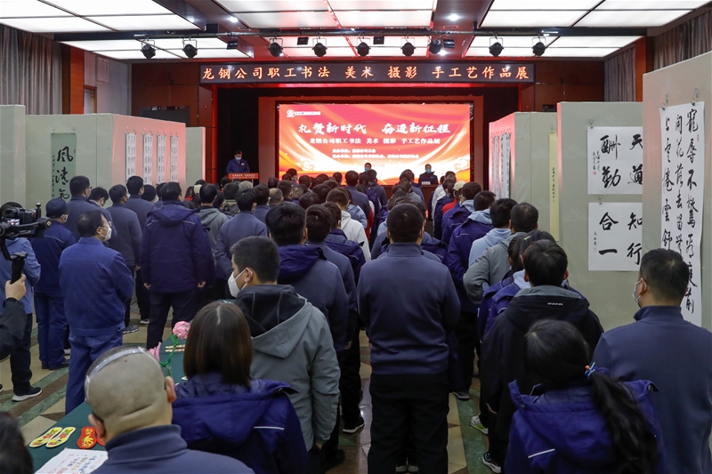 薛社康致辭。他表示,此次書法、美術、攝影、手工藝作品展中,所有作品均是一線干部職工的最新力作。他們通過光影藝術、筆墨抒情,展現(xiàn)了近三年來公司上下一心,“重整行裝再出發(fā) 浴火重生開新局”的鏗鏘步伐,謳歌了龍鋼工匠、勞動模范等先進典型,展現(xiàn)了廣大干部職工積極投身企業(yè)生產(chǎn)一線的火熱場景和歷史記憶。同時也為廣大書畫、攝影愛好者提供了一個發(fā)現(xiàn)自我、充實自我、展現(xiàn)自我的舞臺,引導全體干部職工從黨的故事、革命的故事、龍鋼的故事中,堅定理想信念,汲取奮進力量。希望廣大干部職工以此次活動為契機,追憶初心故事、傳承紅色基因,在黨的二十大精神指引下,堅定不移跟黨走、團結奮進新征程,在藝術創(chuàng)作和工作生活中,弘揚偉大建黨精神,自信自強、守正創(chuàng)新,踔厲奮發(fā)、勇毅前行,為企業(yè)高質量發(fā)展作出新的更大的貢獻。