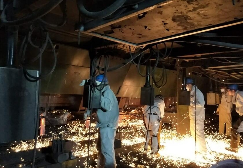 最后一站是攝影記者們向往已久的煉鋼。走進煉鋼新區(qū),“打造中國最具競爭力的高端鋼鐵材料服務(wù)商,建成美麗幸福新陜鋼”的巨幅宣傳牌不禁讓人精神一振。當(dāng)走過爐前的“文化長廊”后,加廢鋼的斗子懸在轉(zhuǎn)爐上空,操作室內(nèi),爐長張社寧仔細地觀察著各個下料成分、重量的數(shù)字變化,看到我們來熱情地打招呼。來到連鑄機平臺,一名爐前工喊著“讓一下,小心燙”,一邊用厚厚的白手套挑著鋼釬,經(jīng)詢問原來是剛換下來的中包結(jié)晶器套管。中包工們一字排開站立在中包各流口前,操作著中包拉鋼設(shè)備,看著火紅的鋼水聽話地流進結(jié)晶器口,前邊是鋼水的炙烤,后邊吹風(fēng)機呼呼地吹著,鐵打的人也會因為8小時的長時間站立而困乏顫抖,他們的毅力難以想象。“爐內(nèi)煉鋼,爐外練人”的傳說真是再現(xiàn)了這種情景。