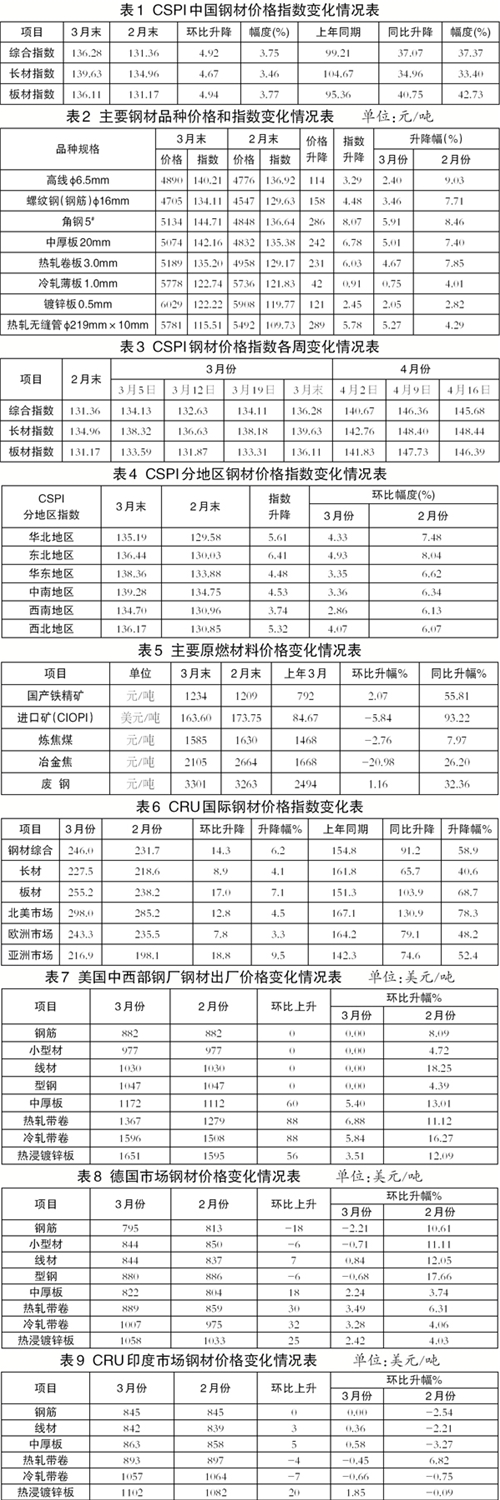 3月末,CSPI長(zhǎng)材指數(shù)為139.63點(diǎn),環(huán)比上升4.67點(diǎn),升幅為3.46%;CSPI板材指數(shù)為136.11點(diǎn),環(huán)比上升4.94點(diǎn),升幅為3.77%,比長(zhǎng)材升幅高0.31個(gè)百分點(diǎn);與去年同期相比,長(zhǎng)材指數(shù)上升34.96點(diǎn),升幅為33.40%;板材指數(shù)上升40.75點(diǎn),升幅為42.73%。(見圖2、表1)