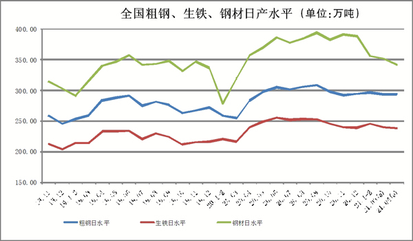 根據(jù)重點統(tǒng)計鋼鐵企業(yè)產(chǎn)量估算,本旬全國共生產(chǎn)粗鋼2933.68萬噸,日產(chǎn)粗鋼293.37萬噸、環(huán)比增長1.14%、同比增長12.60%;生產(chǎn)生鐵2386.64萬噸,日產(chǎn)生鐵238.66萬噸、環(huán)比增長0.70%、同比增長8.10%;生產(chǎn)鋼材3422.50萬噸,日產(chǎn)鋼材342.25萬噸、環(huán)比下降0.83%、同比增長12.73%。本月累計平均日產(chǎn),全國粗鋼環(huán)比下降0.05%、同比增長12.60%,生鐵環(huán)比下降0.36%、同比增長8.10%,鋼材環(huán)比下降2.58%、同比增長12.73%。