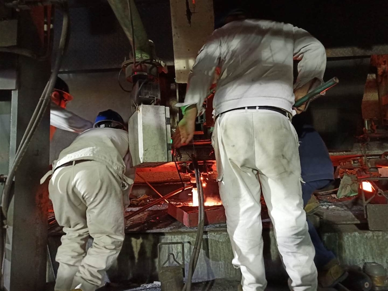 爭分奪秒搶時(shí)間。換包不僅要追求穩(wěn)定順行,更要追求速度快,短時(shí)間內(nèi)順利完成換包,是一件非常自豪的事。接到主控室發(fā)出的“下爐開始換包”指令后,大包工緊盯鋼水液面,其余人員全部在現(xiàn)場待命。待大包澆完關(guān)包后,班組長拿著油缸,沖到鋼流前,一個(gè)接著一個(gè),嫻熟地進(jìn)行堵流,中包工立即將拉速回零,下套管和連接棒,然后迅速填補(bǔ)冷料。此時(shí)的主控工全神貫注,眼睛不僅要盯著平臺(tái)上的作業(yè),還要隨時(shí)用話筒傳播著信息,手下更是不能出錯(cuò),認(rèn)真操作著電腦關(guān)停二冷水。堵流結(jié)束后,按照班長的分工,有的指揮天車退包,有的開走中包車,有的鉆進(jìn)二冷室檢查鋼坯狀況,有的量定尺,有的檢查水壓力,有的割尾坯,整個(gè)生產(chǎn)場面就像要迎來一場大型戰(zhàn)役一樣,大家都是跑著搶著干活,沒有一個(gè)閑人。
