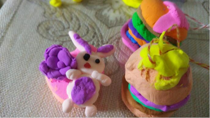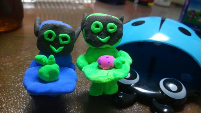 妮子的手很巧,一盒橡皮泥在她的手里像施了魔法似的千變?nèi)f化,想要什么就捏什么:有七彩虹,有美味的心形蛋糕,有漂亮的蝴蝶仙子,有吃著胡蘿卜的兔子,有躺在嬰兒車?yán)锏男雰?,有套在手指上的大花指環(huán),有掛在脖子上的漂亮吊墜,有小茶壺和小茶杯。旸程喜歡機(jī)器人,她就在手機(jī)上看了一眼,不一會功夫就捏出來了:藍(lán)色的身子,方形的頭,圓圓的眼睛,尖尖的耳朵,手里還托著個盤子,是專門送水或者送別的東西用的,竟和手機(jī)上的機(jī)器人相差無幾。旸程直夸“真不錯,真像,姐姐真棒!”再一會功夫,妮子又捏出了另一個機(jī)器人,倆人學(xué)機(jī)器人走路,學(xué)機(jī)器人對話,玩得不亦樂乎。