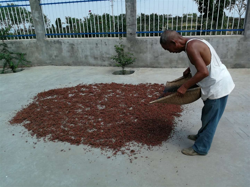 中午吃飯的時(shí)候,爺爺就不見了,只聽見院子里“嚓嚓嚓”的聲音,隨即我來到院子里看見爺爺在收花椒,摸了摸花椒還沒干就問爺爺:“爺爺,花椒還沒曬干怎么就收了。”爺爺說道:“這曬花椒不能曬的太干了,太干了花椒就碎了,不好脫籽”說著爺爺已經(jīng)將花椒掃成一堆,用木扒將花椒輕輕地拍打,使花椒籽從花椒上脫離出來,隨后將大部分花椒用木扒扒出來晾曬,剩下的花椒和籽混在一起不好分離,這時(shí)候爺爺就用簸箕將花椒和籽用他的多年技術(shù)給分離出來??粗鵂敔敻傻暮貌粺狒[我也試著干了一會(huì),發(fā)現(xiàn)花椒粒沒有從花椒籽里分出來,它們還是混在一起,看來這個(gè)活還得慢慢積累經(jīng)驗(yàn)。