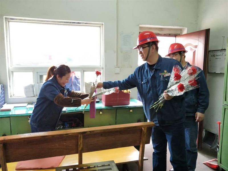 該單位領導還走進了生產(chǎn)線操作臺、成品區(qū)域等女工的崗位,一一進行慰問并送上鮮花。